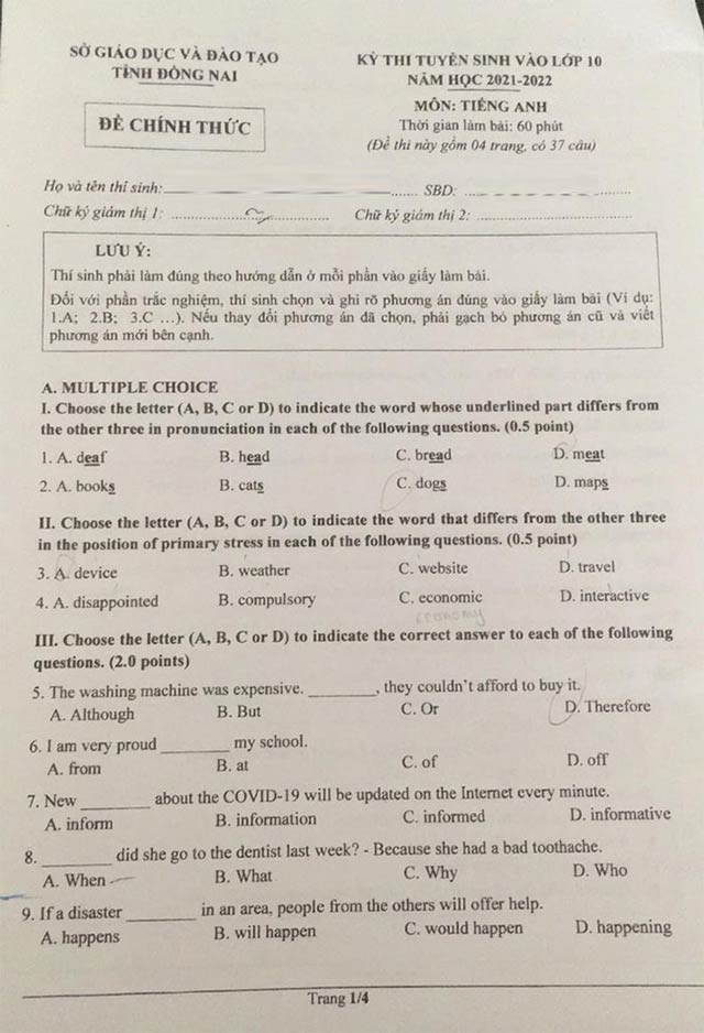 Đề thi vào lớp 10 môn Tiếng Anh Đồng Nai năm 2021