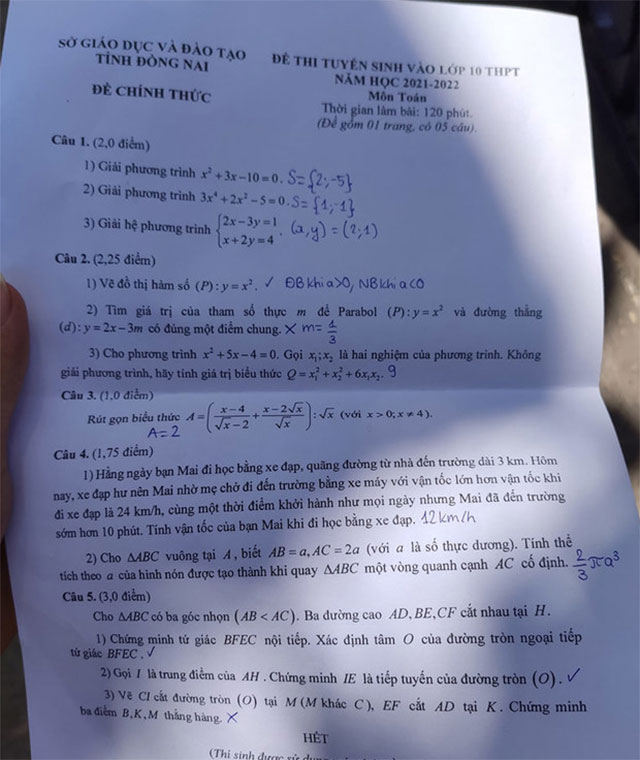 Đáp án đề thi vào lớp 10 môn Toán Đồng Nai năm 2021